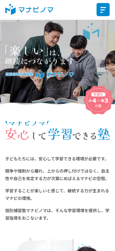 施工事例 HOME > 制作事例 > 学校・保育園・幼稚園 > マナビノマ マナビノマ様 クライアント名 マナビノマ URL https://manabinoma.net/ 制作依頼内容 リニューアル ページ数 6 投稿ナビゲーション 前の制作事例次の制作事例