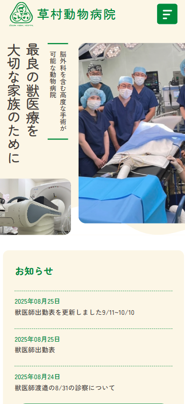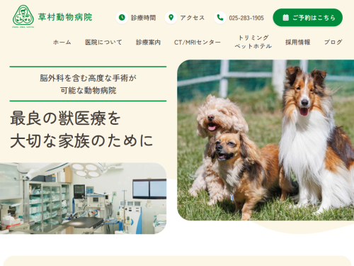 施工事例 HOME > 制作事例 > ペット > 草村動物病院 草村動物病院様 クライアント名 草村動物病院 URL https://soumura.jp/ 制作依頼内容 リニューアル ページ数 9 投稿ナビゲーション 前の制作事例次の制作事例